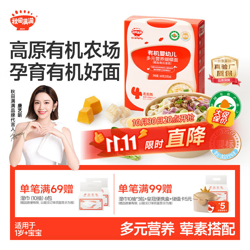 包邮 秋田满满有机蝴蝶面婴儿面条160g鳕鱼南瓜菠菜味1岁+宝宝辅食面100%真验厂